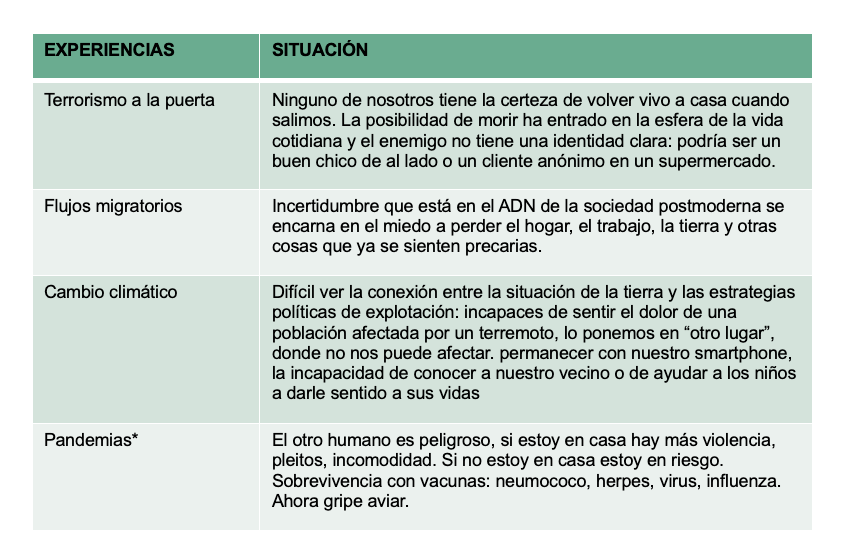Experiencias fuertes que han marcado la vida social contemporánea han ocasionado crisis angustiantes en las personas, el terrorismo (internacional) “a la puerta” que genera impotencia, angustia existencial, incertidumbre matizada con riesgos; los flujos migratorios que generan inseguridad y ambivalencia pues por un lado existe la gana de ser solidario y por la otra el temor de ser violentado e invadido; el cambio climático que genera enojo y miedo a la escasez y agotamiento de los recursos naturales, la violencia de la naturaleza desgastada por el hombre (Spagnuolo, 2016).