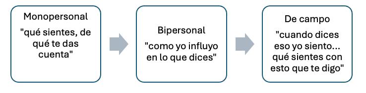 Con esta intervención hacemos que se dé cuenta cómo impacta en el entorno con lo que hace o dice, que no está accesible a su conciencia, y además mantenemos el contacto la presencia. Seguir interactuando juntos y ver qué nos va pasando hace un campo seguro.